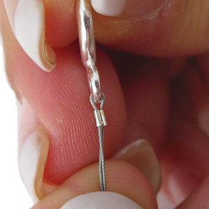 Отрежете тел с желаната от вас дължина, като оставите няколко сантиметра в резерв. Прекарайте телта през стопера и едната част на закопчалката. После отново прекарайте телта през стопера.