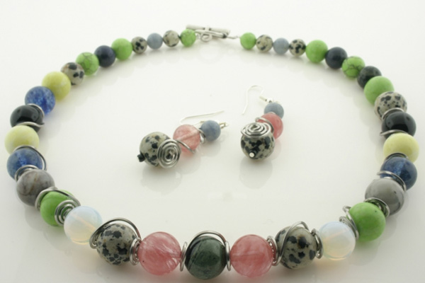 4. Нижете мънистата от полускъпоценни камъни в следния ред: зелен тюркоаз, далматински яспис, авентурин, далматинки яспис – всички по 6 мм; зелен тюркоаз, камбаба яспис, зелен тюркоаз, далматински яспис – всички по 8 мм; горчичен яспис, кварц син мъх, оникс, горчичен яспис, кварц син мъх, черен плетен яспис, зелен тюркоаз, опал, далматински яспис, черешов кварц, камбаба яспис, черешов кварц, далматински яспис, опал, зелен тюркоаз, черен плетен яспис, кварц син мъх, горчичен яспис, оникс, далматински яспис, зелен тюркоаз – всички по 12 мм; камбаба яспис, зелен тщркоаз, камбаба яспис, зелен тюркоаз – всички по 8 мм; далматински яспис, син авентурин, далматински яспис, зелен тюркоаз – всички по 6 мм. На всички мъниста с р-р 12 мм от оникс, кварц син мъх (с изключение на първото – до оникса), зелен тюркоаз, далматински яспис и камбаба яспис трябва да постаите декоративния елемент от тел с квадратен профил. Това става като първо промушите телта за низане през центъра на едната спирала, после през отвора на мънистото, а накрая – и през центъра на втората спирала.