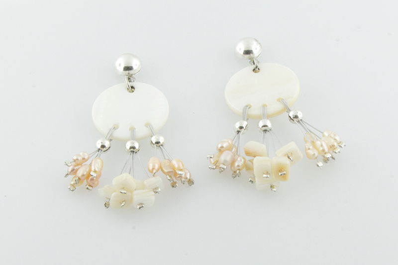2. Нанижете половината перли и половината мъниста от седеф чипс на телта със стоперите.