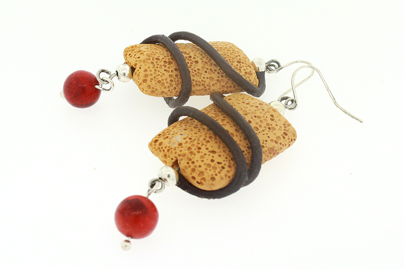6. С помощта на клещите с обли челюсти отворете леко ушетата на телчето с нанизано мънисто от вулканична лава, за да закрепите кукичката за обици от едната страна и телчето с нанизано мънисто от корал – от другата.
