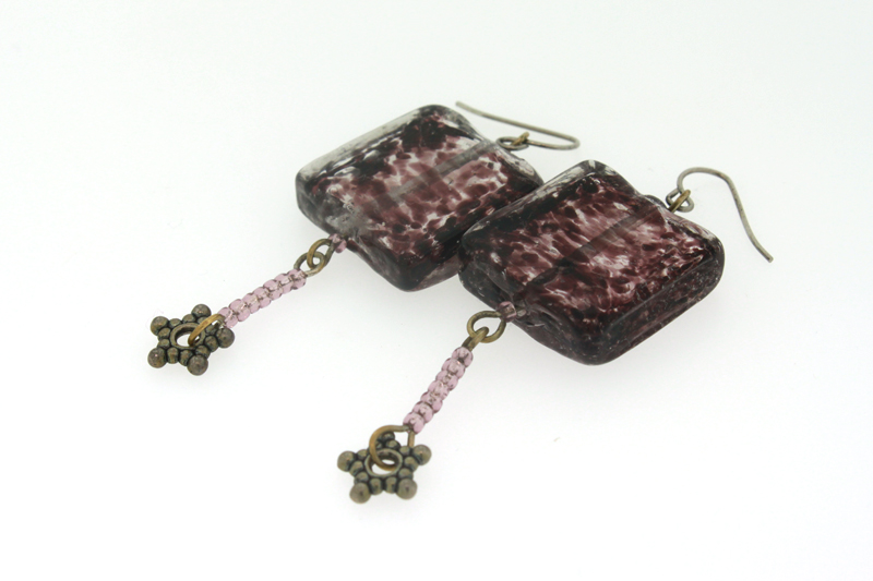 3. Отворете леко ушетата на телчето с нанизано квадратно стъклено мънисто и прикачете висулката от т. 2 и кукичката за обица.