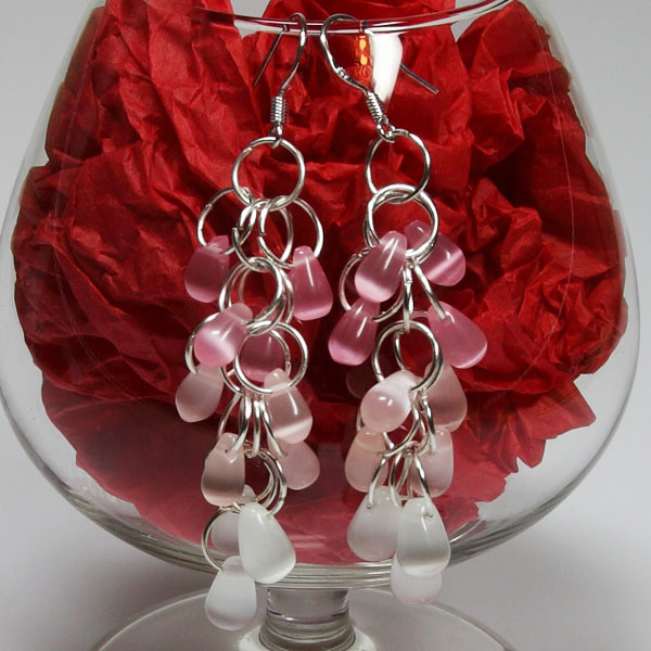 Посребрена единична халкичка 8мм - 34 бр Мънисто капка бял опал с ефект на котешко око 5х8мм - 6 бр Мънисто капка розова вода с ефект на котешко око 5х8мм - 8 бр Мънисто капка розалин с ефект на котешко око 5х8мм - 8 бр Посребрени кукички за обици с топче и намотка 20мм Необходими инструменти: Клещи с плоски челюсти Инструкции за изработка: |