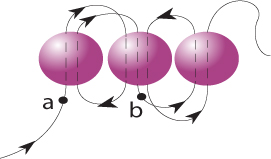 1. Този начин за низане на цилиндрични мъниста и мъниста зрънца често се използва за т.нар. плетка зидария (brick stitch) и рибена кост (Ndbele). Вземете две мъниста, като оставите 10 см от началото на нишката. Прокарайте нишката през двете мъниста в същата посока. Изтеглете горното мънисто надолу, така че мънистата да застанат едно до друго. Нишката излиза от долната част на второто мънисто (a-b). Вземете трето мънисто и прокарайте нишката през второто мънисто от горната му дупка към долната. Задръжте третото мънисто (b-c).