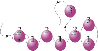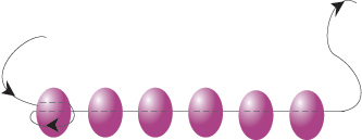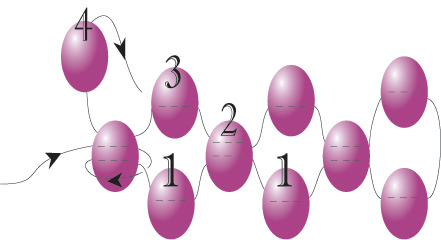 Всяко следващо мънисто от фиг.1 пада надолу наполовина за да оформи ред 1. За да започнете ред 3 (бройте редовете диагонално), изберете мънисто и прекарайте през четвърто мънисто от края. Продължете по същия начин. Завършете като прекарате през нанизването на първото мънисто.