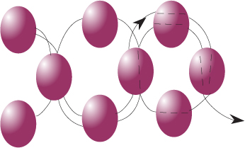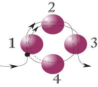 Вземете три мъниста и прекарайте нишката през мънистото, от което сте излезнали като във фиг.37 (първото горно мънисто на ред 1) и първото ново мънисто като прекарвате нишката по часовниковата стрелка.