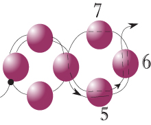 Вземете три мъниста и прекарайте обратно през #6 и първите две нови мъниста. Продължете да добавяте три мъниста за всяка бримка докато първия ред достигне желаната дължина. Правите кръгове в 8-образна фигура и като сменяте посоката на всяка бримка.