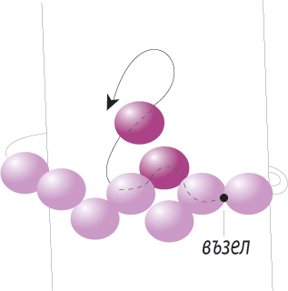 Четен брой мъниста оформят ред 1 и нечетен брой мъниста втория ред. Поставете кръга върху поставка ако желаете. Прекарайте нишката през първото мънисто към лявото на възела. Вземете едно мънисто (#1 от ред 3), пропуснете едно мънисто и продължете към следващото. Повторете същото докато стигнете до началото.