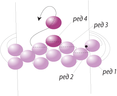 Тъй като сте започнали с четен брой мъниста, трябва да изработите една стъпка за да застанете в подходяща позиция за следващия кръг. Прекарайте нишката през първите мъниста в редове 2 и 3. Вземете едно мънисто и прекарайте през второто мънисто на ред 3; продължете. (Ако започнете с нечетен брой мъниста, няма да има нужда от тази стъпка, а продължете спираловидно).